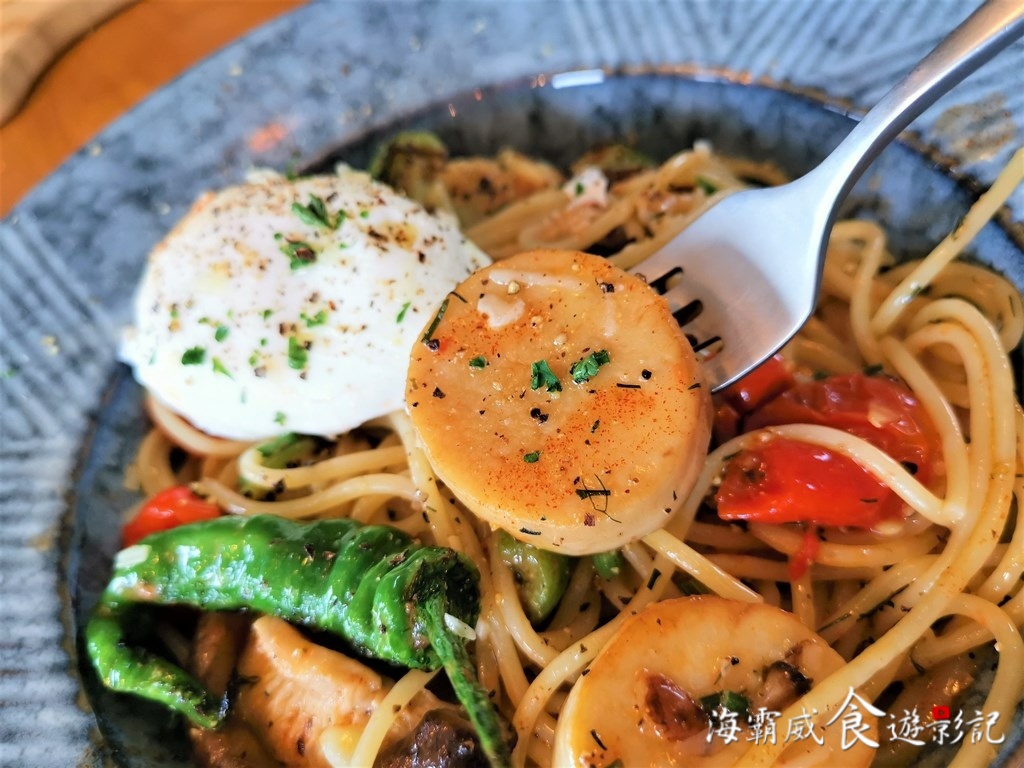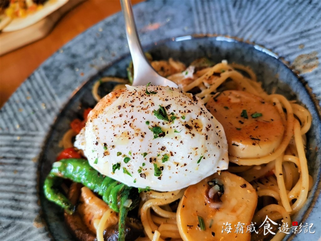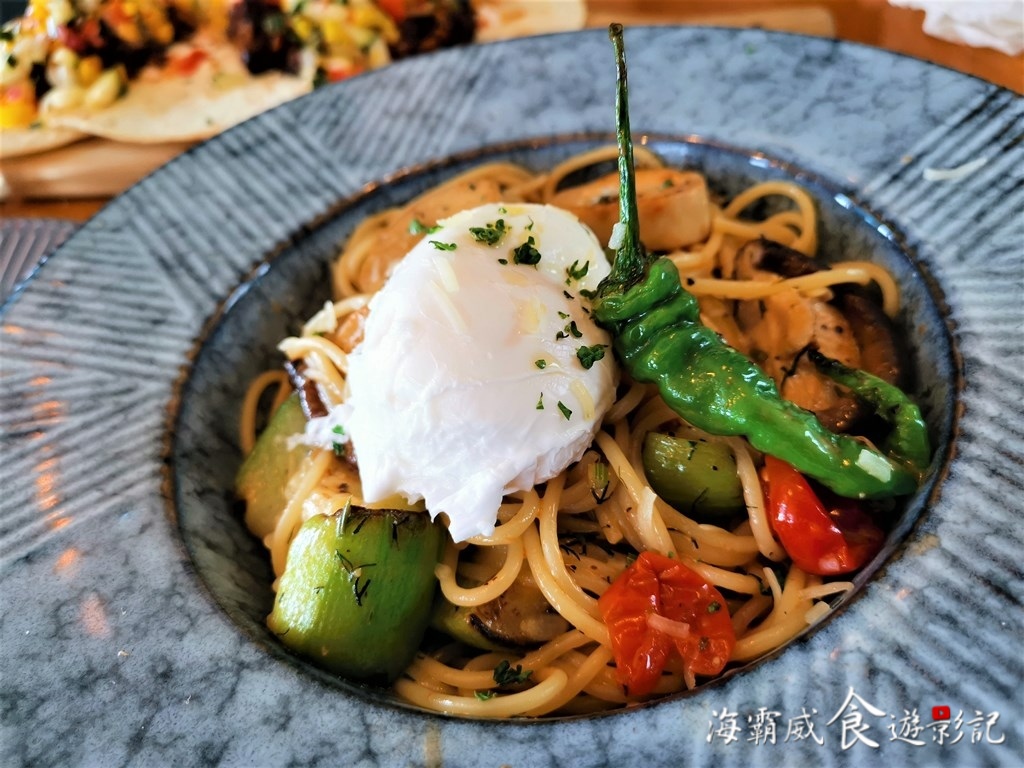 蔬菜義大利麵 230元 白醬風味的的蔬菜義大利麵.配料很豐富吹彈即破的水波蛋,輕輕劃開看著蛋汁慢慢流出讓人覺得療癒,還有那一點都不辣的綠色辣椒,簡單配色讓人食指大動,義大利麵口感入味卻不軟爛,推薦必點!