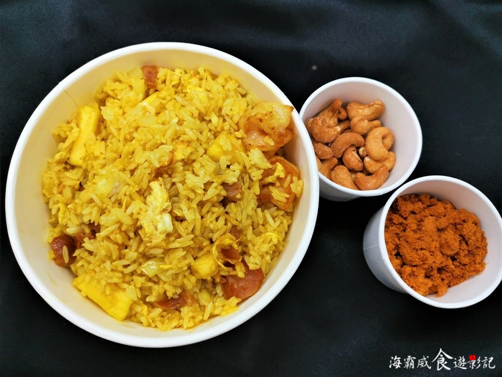 將泰國香米加入新鮮鳳梨、蝦仁、香腸加入泰式咖哩爆炒,搭配肉鬆與腰果一起吃,口感倍增,是道地南洋風味的炒飯.