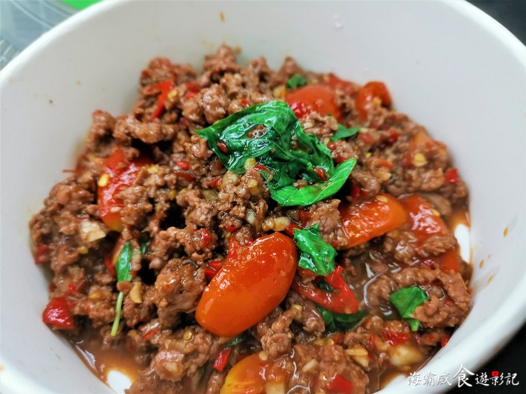 非常泰的辣炒豬肉使用豬絞肉、九層塔、新鮮蕃茄爆炒,因使用九層塔取代泰國的打拋葉,所以不能稱為打拋豬,香辣風味不減.