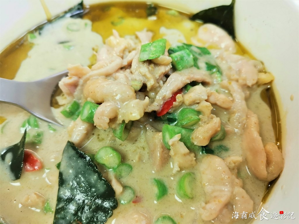 鮮嫩雞腿肉片與脆口的長豆,濃香略辣的咖哩加上進口綠咖哩油提香,淋在泰國香米上,十分下飯好食. 推薦必吃.